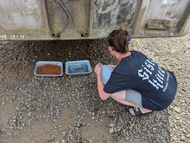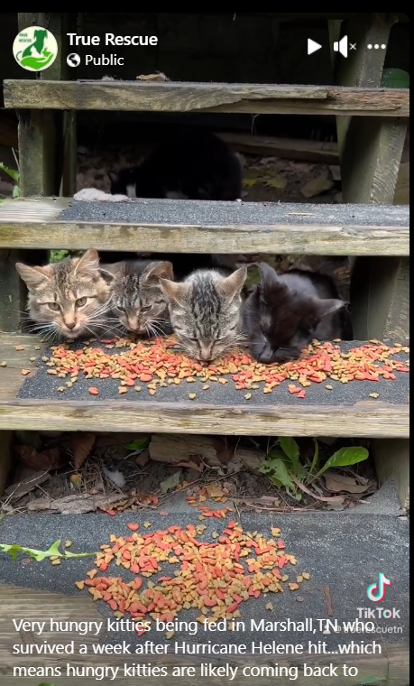 Here is a clip showing food being dropped for kittens that had survived a week on their own in Marshall, TN after the floods hit. Some of these felines were brought back to True Rescue, and some have already been adopted.