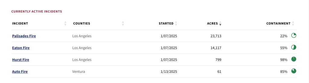 Most of the catastrophic wildfires burning are partially contained with Palisades only contained 22%. 40,695 acres burned near San Fernando, Los Angeles, Pasadena, and Santa Monica. Approximately 12,300 structures burned.